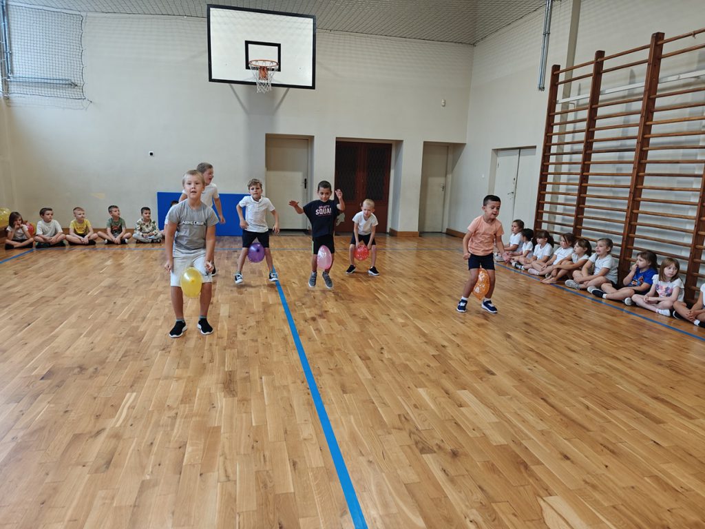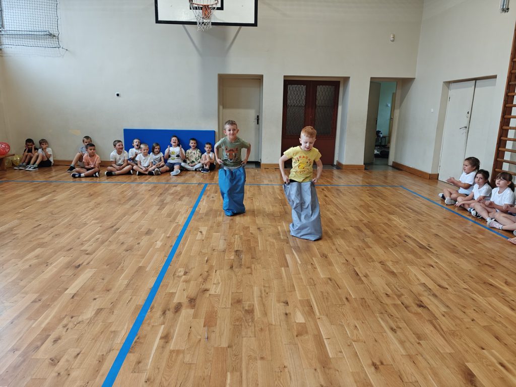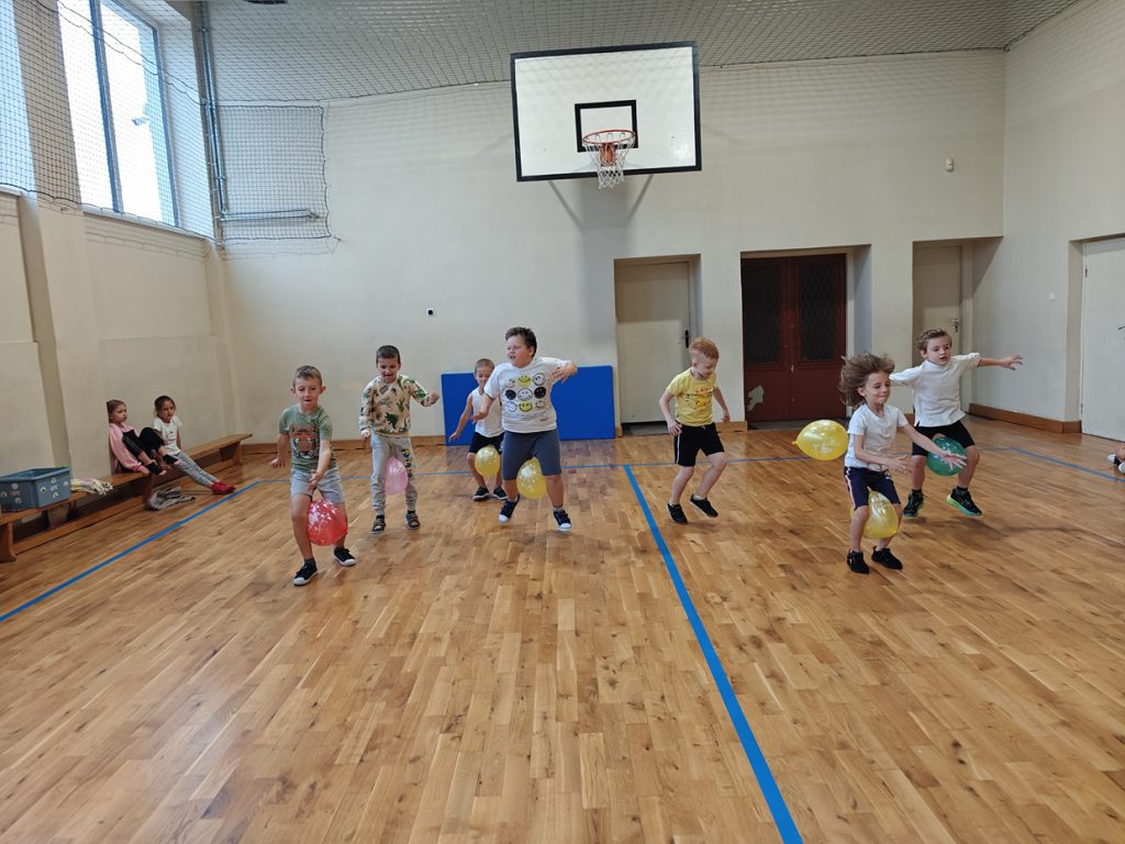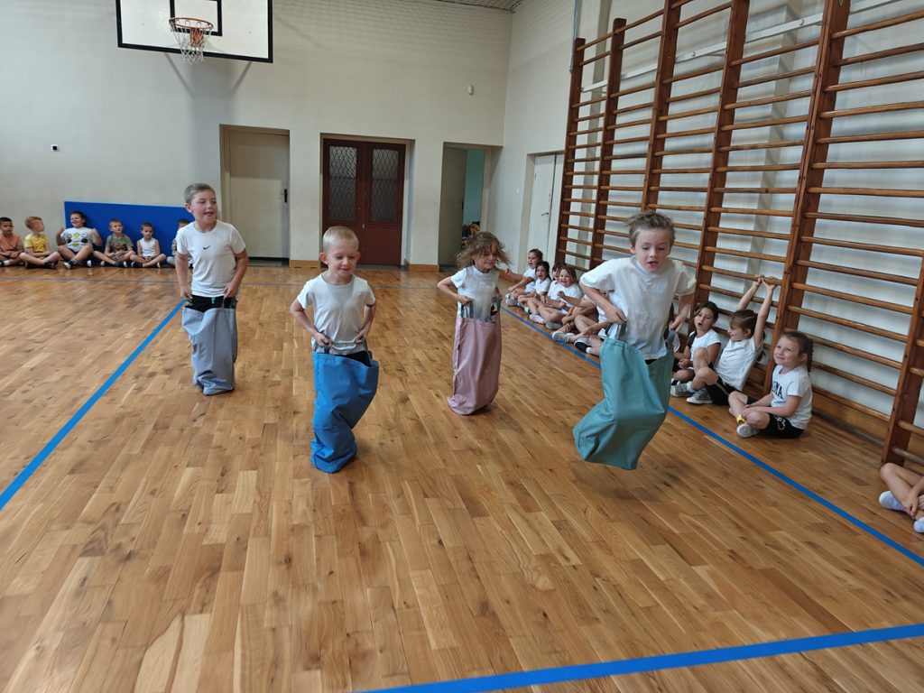 skoki w workach, przenoszenie piłeczki pingpongowej na łyżce, skoki z balonami.🎈