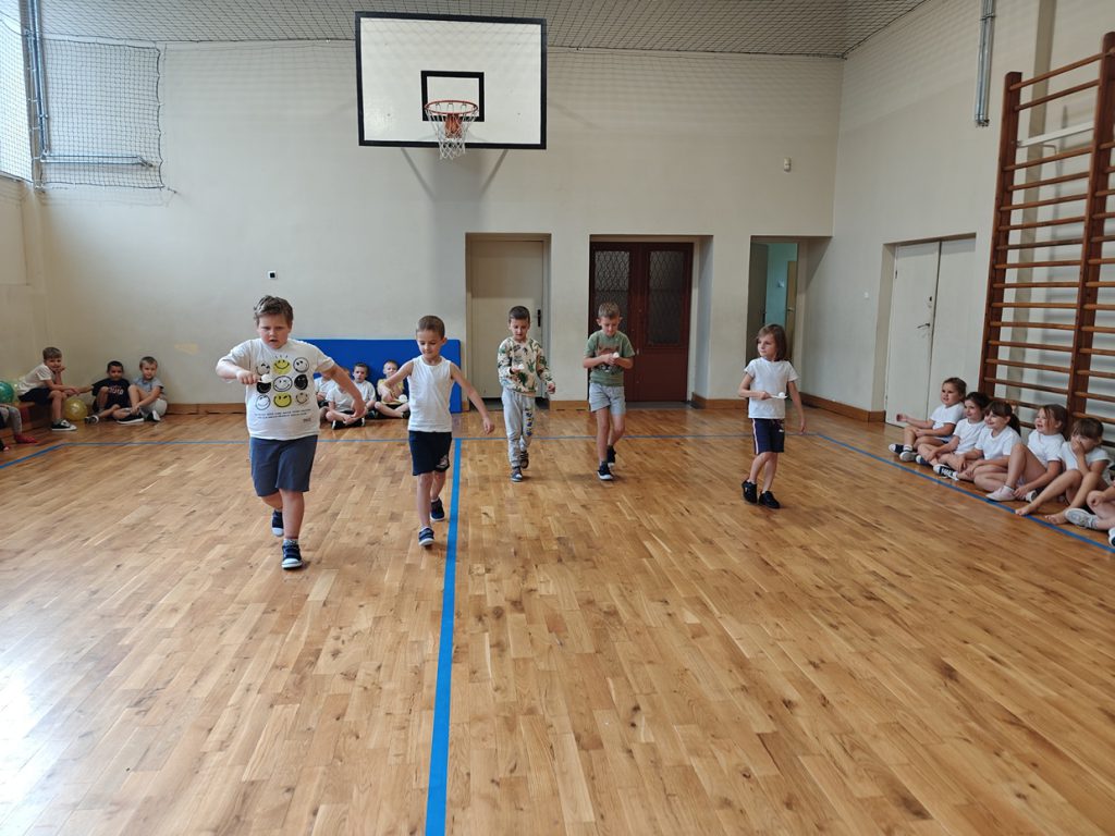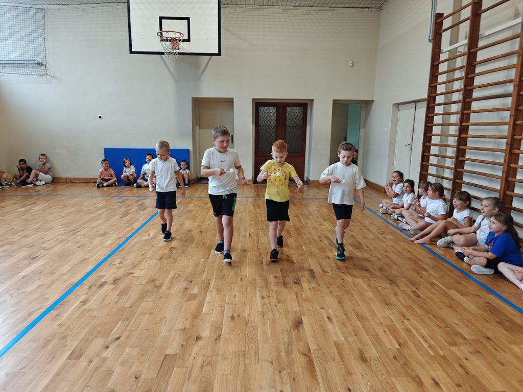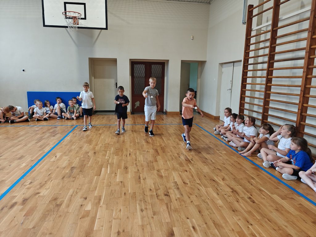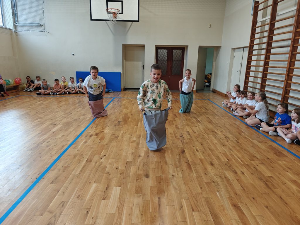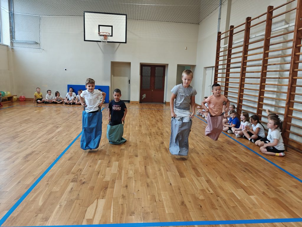 skoki w workach, przenoszenie piłeczki pingpongowej na łyżce, skoki z balonami.🎈
