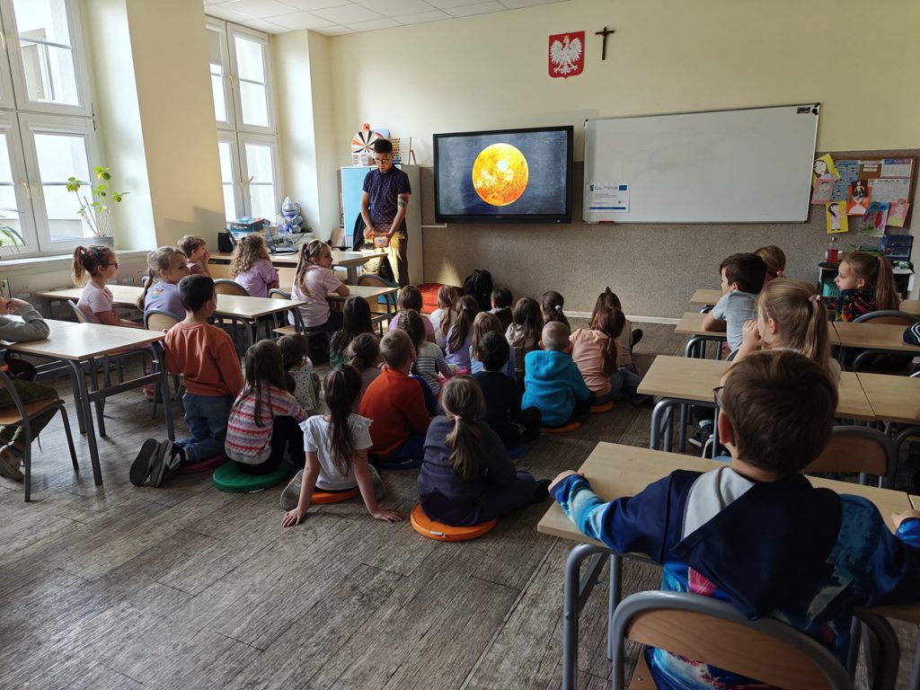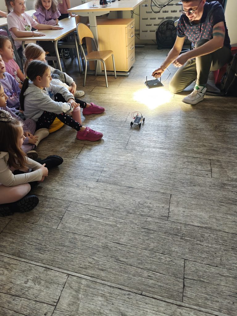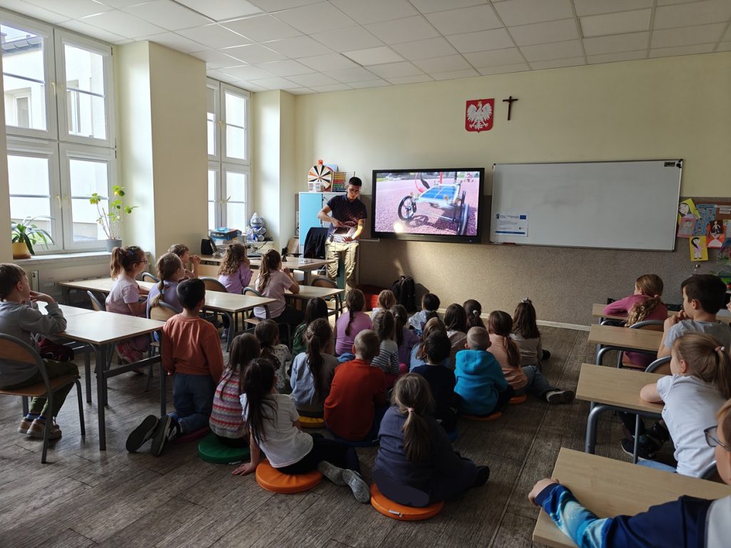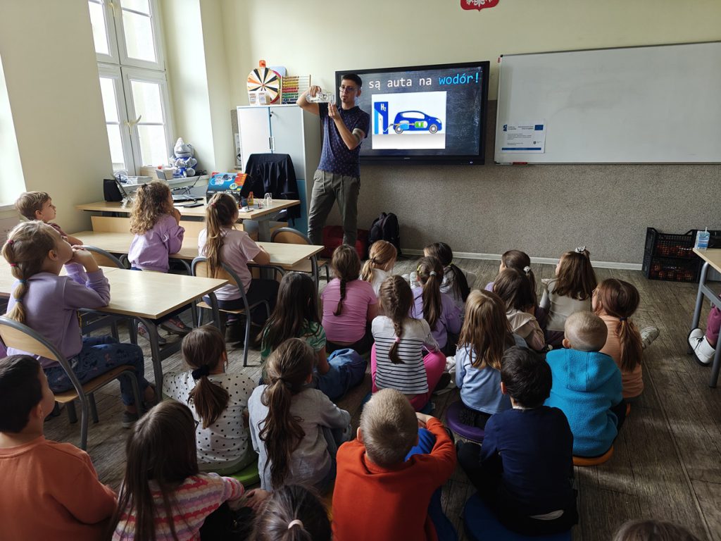 Podczas zajęć zaprezentowano mały panel słoneczny ☀️🔋, który uruchomił samochodzik zasilany energią słoneczną 🚗☀️. Uczniowie wykonali także paliwo z wody, dzięki któremu jeździł samochód na wodór 💧🚗⚡.