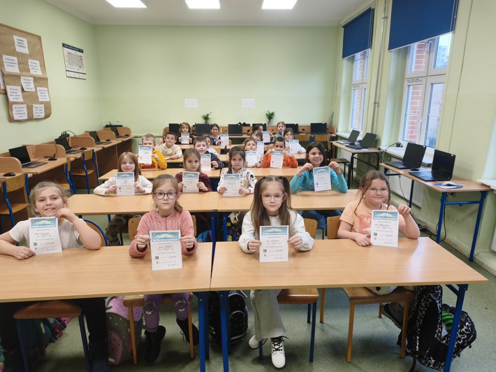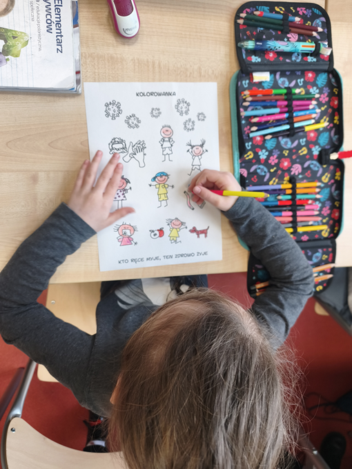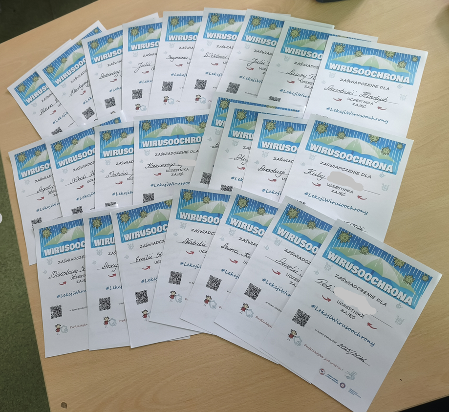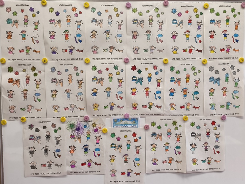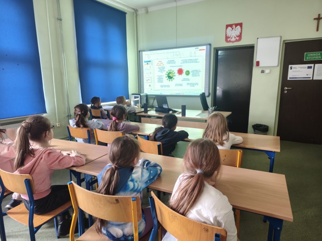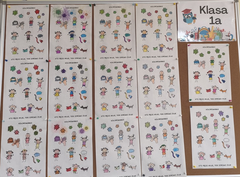 W ramach akcji „Wirusoochrona” uczniowie klasy 1a zapoznali się z zasadami profilaktyki chorób wirusowych przenoszonych drogą kropelkową oraz chorób zakaźnych. Dzieci uczyły się prawidłowej higieny rąk, wysłuchały piosenek pt. „Mydło, woda – tak się zaczyna wirusoochrona” oraz „Umyj łapki”, a także kolorowały ilustracje dotyczące wirusów i bakterii. Wykonane przez uczniów prace zostały powieszone na gazetce klasowej. Zajęcia były bardzo pouczające – uczniowie zdobyli cenną wiedzę, a każdy uczestnik otrzymał pamiątkowe zaświadczenie.