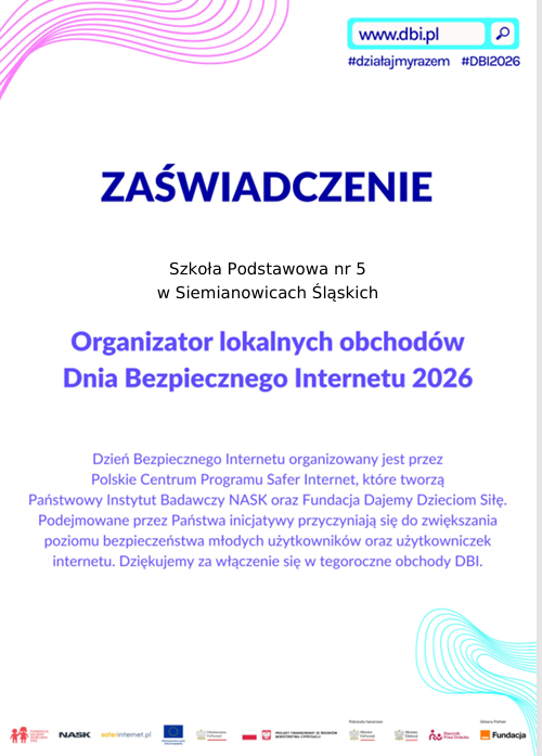 Zorganizowano także konkurs wiedzy dotyczącej bezpieczeństwa w sieci dla klas 5-7. Miejsce I zajęła kl. 5a, miejsce II kl. 6a, a miejsce III kl. 5b. Natomiast uczniowie klas siódmych stworzyli w programie graficznym Gimp plakaty przypominające zasady właściwego zachowania w Internecie.