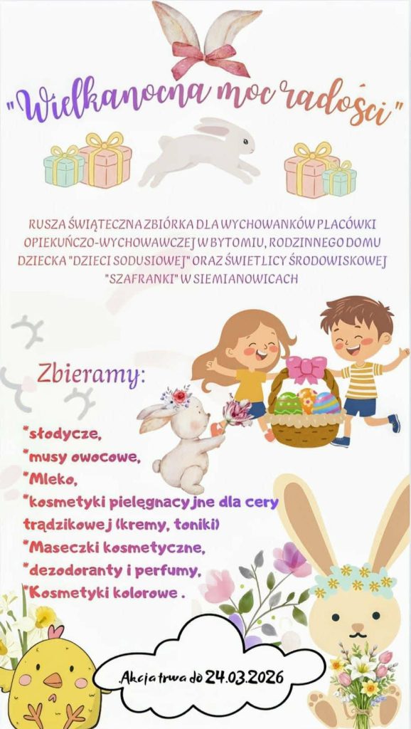 Wolontariusze Siemianowickiej Piąteczki zapraszają do udziału w wielkanocnej zbiórce „Wielkanocna Moc Radości”! 🐰🌷
