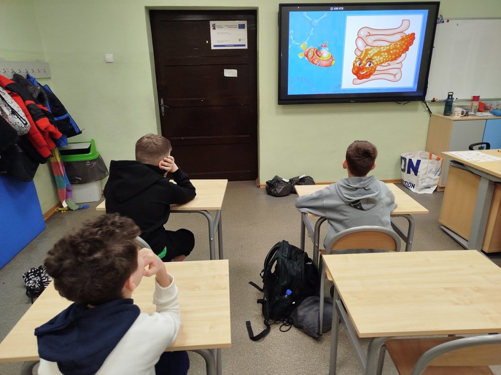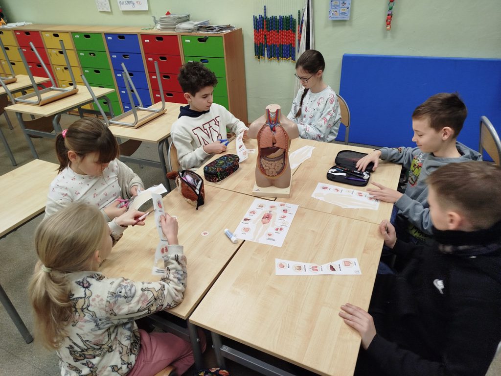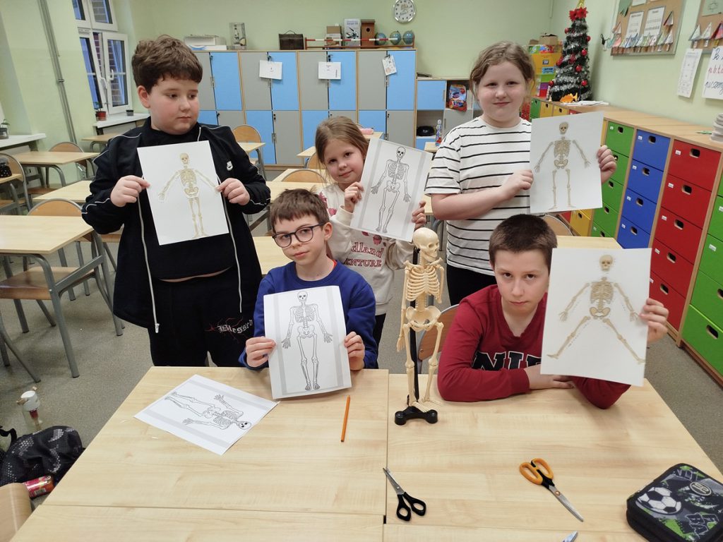 Kilkunastu uczniów z klasy 3b rozpoczęło przygodę z projektem unijnym „Wkręć się w naukę”. Uczestniczą w zajęciach zatytułowanych „Moje zdrowie w moich rękach”. Pozwolą im one lepiej zrozumieć, jak ważne jest dbanie o zdrowie oraz podejmowanie właściwych decyzji prozdrowotnych. Na pierwszych zajęciach musieli zmierzyć się z testem „na wejściu”. Następnie wspólnie zastanawialiśmy się czym jest zdrowie a czym choroba. Dzieci tworząc mapę myśli ułożyły własną definicję tych pojęć. Na dwóch kolejnych spotkaniach uczniowie zapoznawali się z budową wewnętrzną człowieka. Najpierw podczas oglądania filmu edukacyjnego wybrali się na wycieczkę w głąb ludzkiego ciała. Poznali najważniejsze narządy w ciele człowieka. Dowiedzieli się jak są zbudowane i do czego służą. Później utrwalali wiedzę z wykorzystaniem modeli i wykonywali w parach zadania polegające na złożeniu układu kostnego i właściwym ułożeniu poszczególnych narządów wewnętrznych na narysowanym ciele człowieka. Zajęcia spotkały się z dużym zainteresowaniem uczniów i były dla nich atrakcyjne oraz angażujące. Dzieci chętnie uczestniczyły w proponowanych aktywnościach, wykazywały się ciekawością poznawczą i aktywnie współpracowały w parach. Dzięki różnorodnym formom pracy – filmowi edukacyjnemu, modelom oraz zadaniom praktycznym – uczniowie w przystępny sposób poszerzyli swoją wiedzę na temat budowy i funkcjonowania ludzkiego ciała.